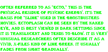 Often referred to as "ecto," this is the physical residue of psychic energy. It's the basis for "slime" used in the Ghostbusters movies. Ectoplasm can be seen by the naked eye, and is best viewed in dark settings since it is translucent and tends to glow. It is very unusual Researchers often describe it as a vivid, X-Files kind of lime green. It usually fades from sight gradually.