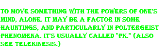 To move something with the powers of one's mind, alone. It may be a factor in some hauntings, and particularly in poltergeist phenomena. It's usually called "PK." (Also see telekinesis.)